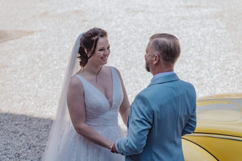 Het moment dat jullie elkaar voor het eerst zien op de grote dag… dat is er eentje hoor. Of je nu een traan laat of de slappe lach krijgt – ik leg het vast zoals het gebeurt. Geen ingrijpen, geen gedoe. Gewoon jullie, zoals jullie echt zijn, met alles erop en eraan.